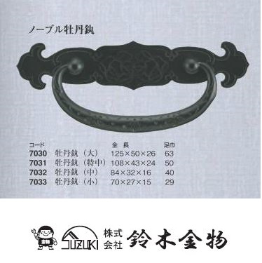 ■色 :時代色(艶消し黒) ■材質 :真鍮(取っ手)、鉄(座) ■着色 :焼付け塗装 ■取付 :六角ナット止め ■付属品:六角ナット、ワッシャー、キャップ ■牡丹柄を施した取っ手です。 ■本商品は日本国内で製造しています。 ■やDIYなどにご活用ください。